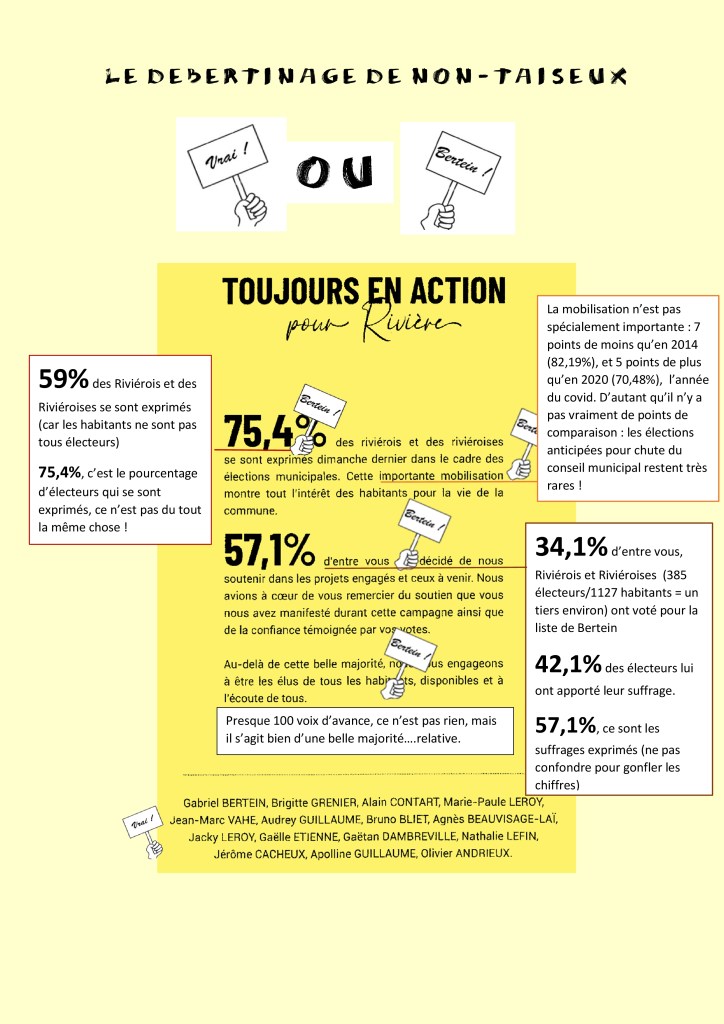 - Gabriel Bertein avait demandé de voter la suppression de poste d’un agent qui donnait toute satisfaction à l’école en assistant de façon très précieuse les enfants. Il avait laissé croire aux conseillers que cette future non-reconduction était bien acceptée par l’agent, et qu’une association employeuse lui permettrait de travailler préférentiellement aux environs de Rivière. Tout cela s’était révélé fallacieux après enquête d’un conseiller. Après lecture par un conseiller majoritaire d’une lettre de l’agent, et constatant qu’il aurait le mauvais rôle, Gabriel Bertein avait voté contre sa propre proposition à la surprise générale, montrant ainsi son goût de « faire des coups ». Seule la première adjointe et l’adjoint aux travaux avaient assumé leur décision en votant contre la reconduction, se retrouvant ainsi en minorité.